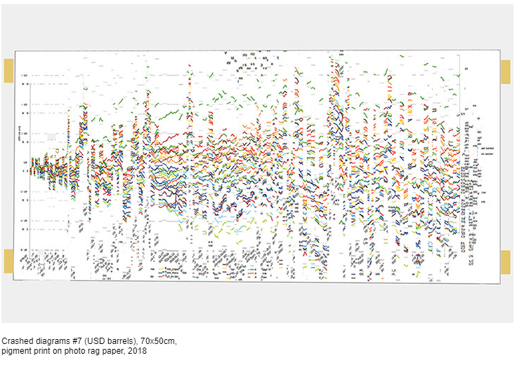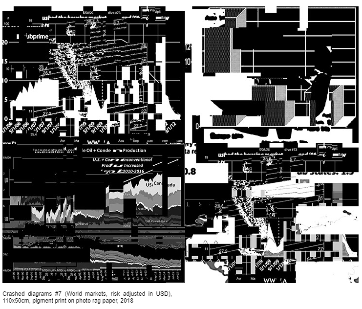 Faire de l’illisible un spectacle nous renvoyant à notre lassitude des signes. Décollés, lacérés, les chiffres qui évaluent les chiffres, ces derniers censés devenir plus lisibles, deviennent percepts visuels, ne renvoient plus à rien d’autre qu’à eux-mêmes. Une trace du contexte de leur production permet encore de mesurer leur désarroi. Le crash est une étape révolutionnaire vers la tabula rasa. Le crash brise les liaisons covalentes entre abscisses, ordonnées, légendes & courbes. Le crash opère à la manière d’une bombe. La représentation fissionnée occupe alors un autre territoire : le spectaculaire, et non plus l’informatif d’une place cambiste. Informatif spectacularisé par un aggiornamento artistique : retourner les algorithmes contre eux-mêmes, et voir ce qu’un tel dispositif transforme en nous.