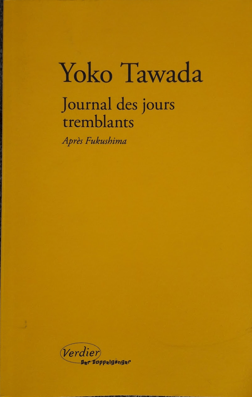 441. Lisant le Journal des jours tremblants, Après Fukushima de Yoko Tawada (Verdier, 2012), écrivaine née à Tokyo et qui vit en Allemagne depuis 82, je me laisse emporter par ses Trois leçons de poétique, précédant les quelques pages du Journal. Livre recommandé par Ludovic B., et qui me surprend : j’attendais l’écriture diariste d’une rescapée, rien de cela, mais trois leçons de poétique prononcées à Hambourg, la 1ère le 4 mai 2011, juste après la triple catastrophe de Fukushima. Une auteure japonaise, parlant japonais et allemand, vivant en Europe : voilà qui attire toute mon attention. Friction des langues, des imaginaires ; insularité japonaise et altérité occidentale, pour examiner au plus près des langues (japonais donc, allemand, afrikaans, portugais…) l’image que se sont faite du Japon les étrangers, depuis les premiers Portugais jusqu’à aujourd’hui. Écriture enrichie de cette perspective cavalière sur les époques et les cultures, du bilinguisme allemand/japonais- beaucoup à dire sur la structure de ces deux langues et la vision du monde qu’ils véhiculent. Il est aussi beaucoup question de la traduction (d’ailleurs, les trois leçons sont traduites de l’allemand par Bernard Banoun, et le journal est traduit du japonais par Cécile Sakai ; et la collection de l’édition Verdier s’appelle «der Doppelgänger », soit « soi-même comme un double » : cela éclaire, non pas de manière préromantique allemande, mais d’un point de vue linguistique, le jeu de miroir qui établit un entre-langues fécond.