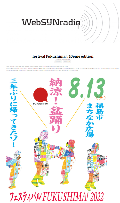 La volonté de Otomo Yoshihide et Ryoichi Wago, fondateurs de cet événement qui se tient sur l’une des places principales de Fukushima city, est d’ancrer la thématique de la catastrophe nucléaire dans une tradition festive qui permet de déplacer les perceptions usuelles et redonner un “sentiment de joie” aux habitants d’une région encore meurtrie et stigmatisée. » Dominique Balaÿ