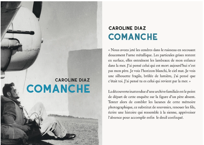 Le titre : un Indien d’Amérique, loin de moi, un rêve d’enfant. Je découvrirai qu’il s’agit d’un autre Comanche. J’aime ce titre, sa typographie colorée sur la photographie en noir et blanc d’un pilote d’avion, harnaché, se reposant dans l’ombre prodiguée par un énorme moteur à hélice. Le pilote semble considérer ce titre, et, au-dessus, le nom de l’autrice – heureux augure.