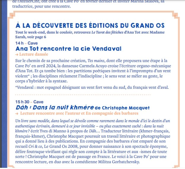 Un bien long silence de ma part. De longs mois, oui, que j’ai consacrés aux relectures, modifications, voire réécritures partielles des Approches de Dâh, entre autres chantiers. Je m’approche donc du manuscrit achevé et de la recherche d’un éditeur. En attendant, l’auteur Christophe Macquet va sortir de sa réserve pour offrir une lecture publique le 17 septembre 2023 à la Cave Poésie de Toulouse (71, rue du Taur). Le fait est remarquable, je m’en réjouis, puisque j’irai l’écouter et le rencontrer in flesh and bones.
