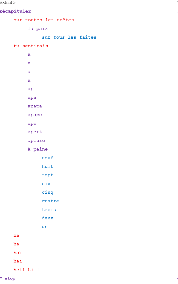 Au cœur de La Machine, de la poésie opérant sous nos yeux, où le poème de Goethe est pré-texte et nouveau texte, au détour de l’un des innombrables chemins qui le composent, soudain, des culs-de-sac : impossible d’aller plus loin. Voyez vous-même les trois extraits suivants :