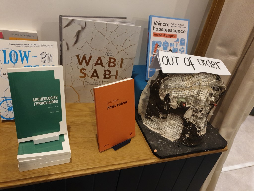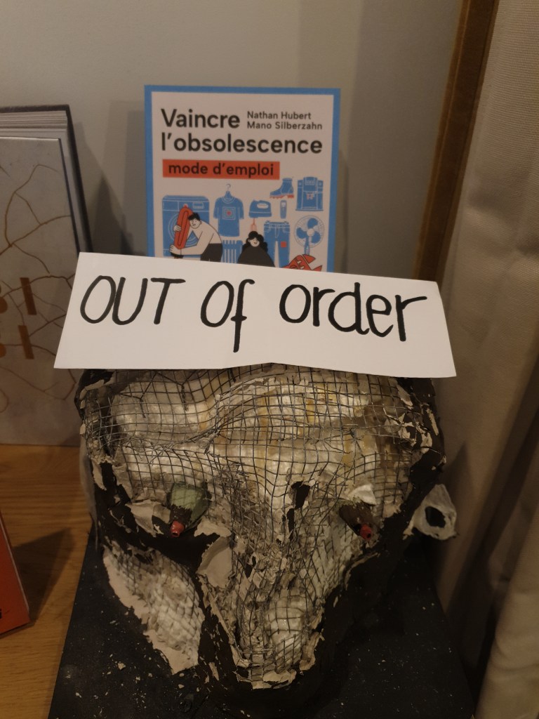 Le second est celui, inattendu, d’une certaine tête, longtemps maltraitée, puis cassée à coups de marteau (nietzschéen) lors d’une performance à la librairie L’Épluche-Livres. De passage aujourd’hui pour saluer Anne et Daïdrée, je retrouve c’te vieill’tête dûment recyclée, entourée de livres sur l’obsolescence, etc. Ah la vache ! J’avais pas tourné le dos qu’elle menait sa vie !