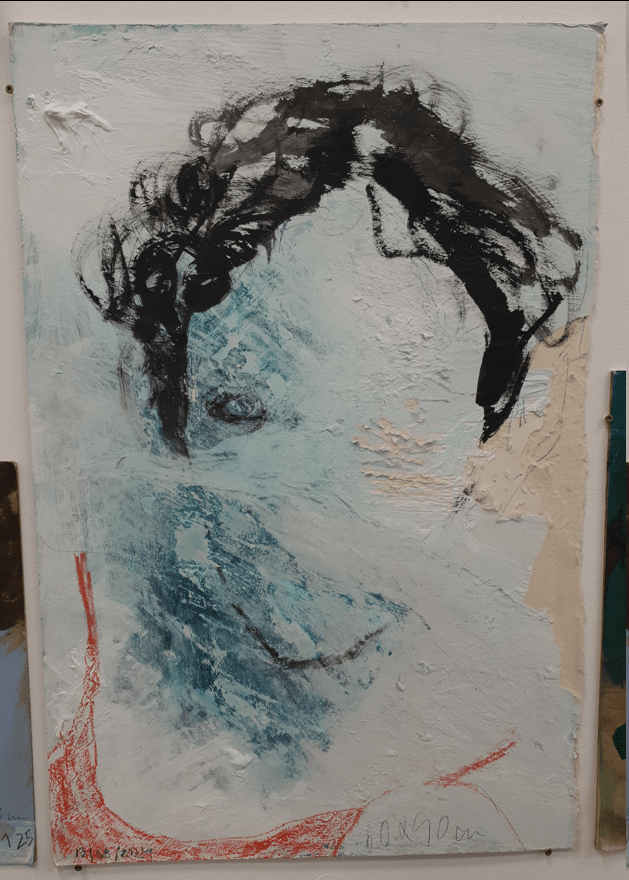 Quand Maite Soler, dans une totale liberté, fait un fond bleu sombre pour détourer un masque blanc à l’orbite insondable, où s’allume un incendie dans les cheveux, on voit je ne sais quel effrayant spectre, quelle réminiscence des vanités cinglant leur memento mori, un masque de butô hanté par la danse des ténèbres.