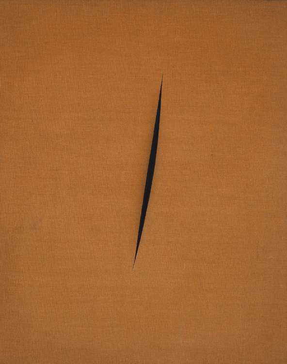 Shyamalan fait un plan sur la toile déchirée, et l’on voit comme un tableau conceptuel de Lucio Fontana, un « concept spatial » qui figure les dualités dont je parlais. Toile du visible lacérée, et c’est l’intrusion de l’espace extérieur dans celui du véhicule ; l’écran du cinéma est saturé par cette toile-frontière, la toile elle-même devient écran où le spectateur projette les évènements à venir : la mort certaine des passagers, mais aussi, sans doute, ses propres peurs du dehors, de l’autre, de la mort. Cette toile-écran montre une plaie lumineuse, une irradiation par les photons (métaphore des rayons ionisants). La voiture devient une camera obscura, une chambre photographique à la fois caméra de cinéma et boîte cranienne ; la fente, oeil-lentille, redouble l’objectif des appareils de prise de vue. Ici, Julian et le spectateurs voient, au choix, le soleil ou la mort, « qui ne peuvent se regarder fixement ». « Moi, je troue, l’infini passe ainsi par là. », disait Lucio Fontana.