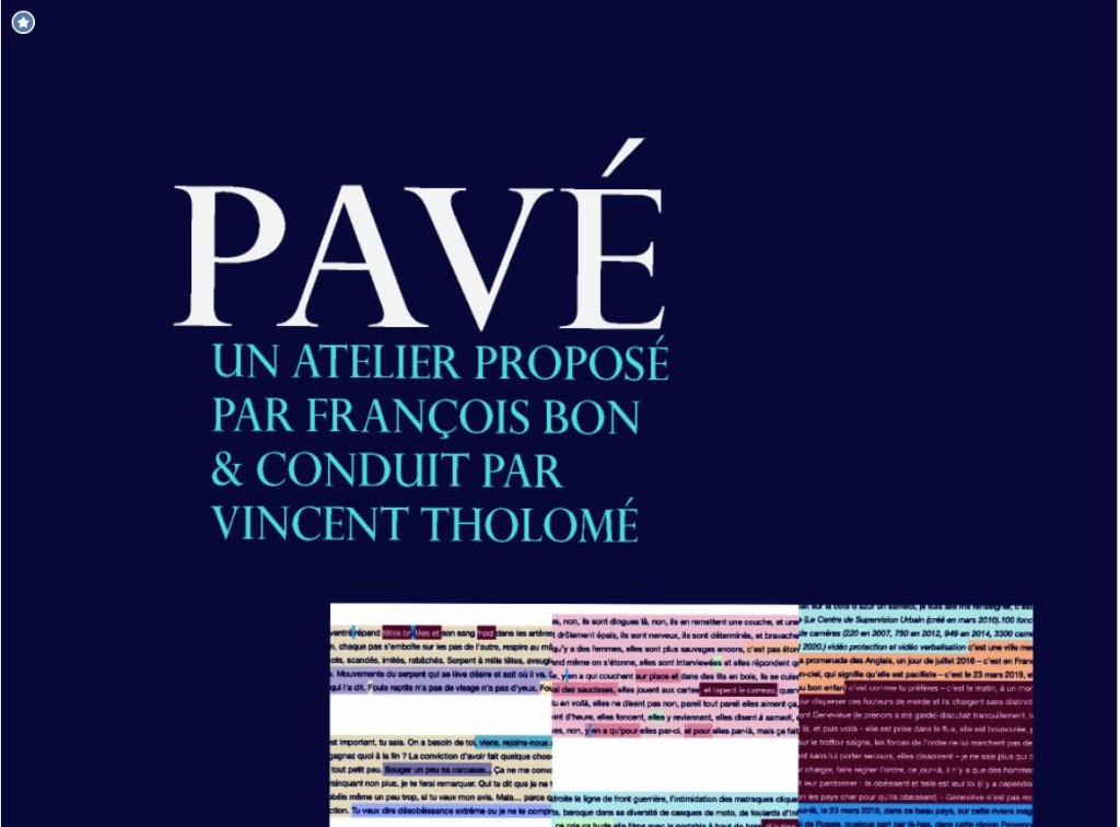 Participant à l'expérience collective de PAVé, en avril 2021, écriture en simultané et en temps limité de trente auteurs sur le thème de l'insurrection, avec retour de chacun sur les textes des autres : lecture, ajouts.