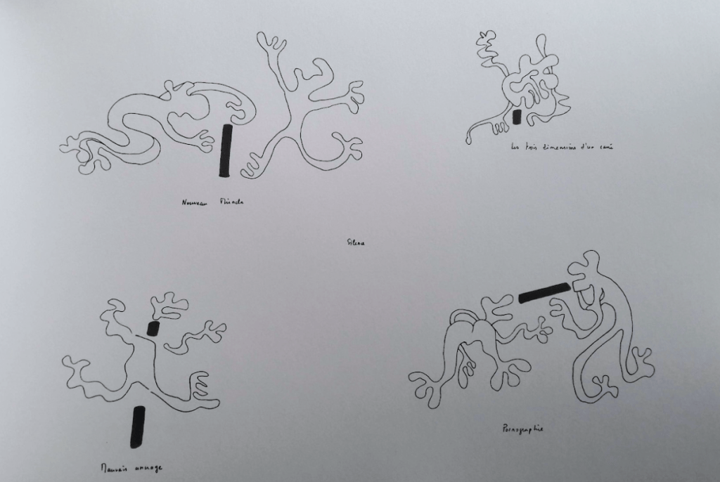« Inquiétantes étrangetés, insaisissables perceptions » (les mots ne sont pas de moi, entendus à propos d’autre chose, mais que je trouve tout à fait en accord avec ce que je ressens), plongée dans le passé (le mien) avec les personnages courbes et hourloupiesques, qui m’apparaissent plus joyeux (comme tu l’annonces dans le titre), innocents et rassurants que les ombres de la deuxième partie aux questionnements métaphysiques et dont les humaines attitudes/formes s’animalisent, se végétalisent, se minéralisent, s’idéogrammisent (pas nécessairement dans cet ordre d’ailleurs ou même parfois en même temps) de façon monstrueuse et donc angoissante pour moi jusqu’à aboutir à une explosion de la matière qui éclabousse dans un crachat ontologiquement terrible. » E. C., décembre 2022