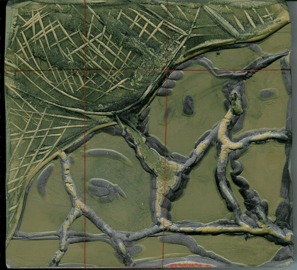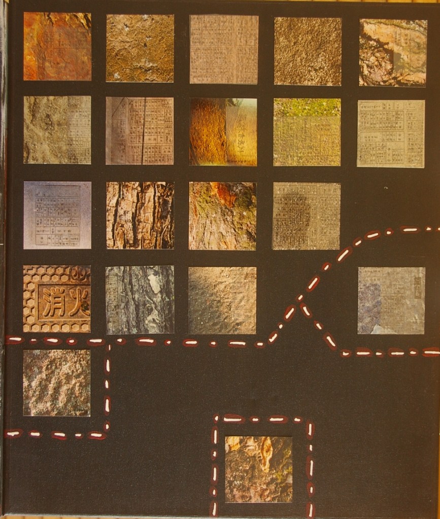sol, bois, gravure sur lino, fil, 17×18.5, 2005